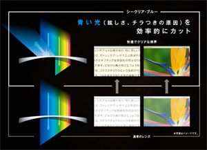 ニコンの新しいレンズコーティング「ニコン シークリア ブルー」は、眼の負担を増大させる「青色光」を約10%反射させてカット。